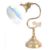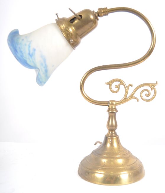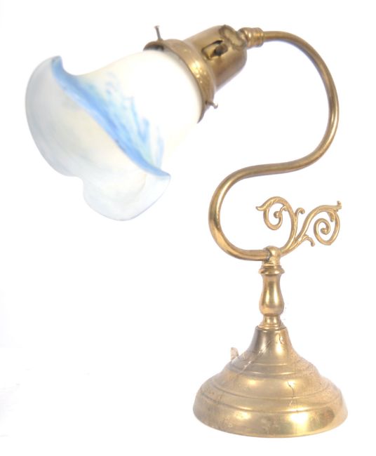 An early 20th Century brass & glass coaching lamp / desk lamp. Coloured glass shade raised on brass scroll arm over a circular pedestal base. Measures approx; 31cm tall.