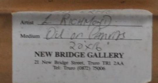 Leonard RICHMOND (1889-1965) - A 20th Century oil on canvas landscape painting scene depicting a harbour scene with covered walkway above the water and tall spire peering over. Other buildings to distance. Measures approx; 57cm x 67cm.