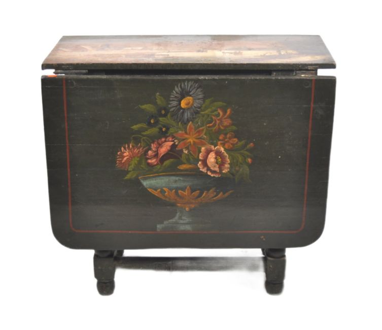 A late 17th Century Hindeloper painted gateleg dining table / side occasional table. The centre portion painted with Winter Landscape scene and the drop flap panels / leaves of classical vases of flowers, fitted drawer to frieze and all raised on bobbin legs & supports. Measures approx; 72cm x 78cm x 40cm.