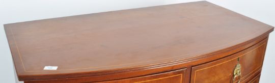 An early 19th Century George III mahogany inlaid bow fronted chest of drawers. The bank of two over three drawers having lion mask ring handles with inlaid decoration all raised on turned legs. Measures approx; 110cm x 108cm x 59cm.