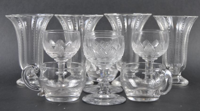 A collection of 10 x 19th century glassware. To include: four cut glass syllabub glasses, 4 x cut glass dram glass, and three punch cups.