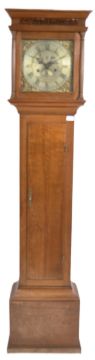 An 18th Century George II Longcase clock by Moses Bradshaw of Charlton Kings Cheltenham Brass face with etched decoration depicting house and sailing boat with faceted hands and Roman Numeral Chapter Ring. Set to a mahogany case with glazed hood door. Measures approx; 193cm x 40cm x 23cm.