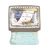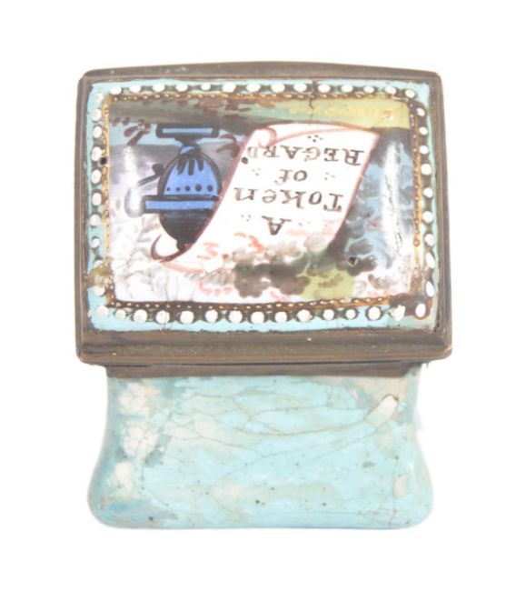 A 19th century square enamelled pill box, the copper lid inset an enamelled with the text " A token of regard ". on the back drop of a nature scene with birds. The base of turquoise colour. The hinged lid opening to reveal a mirror to the reverse of the lid. Approximately 2.5cm tall.