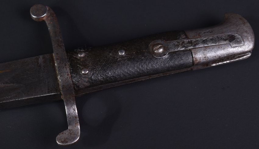 A 19th Century 1856 pattern colonial yataghan sword bayonet. Hooked pommel with press stud and T- shaped attachment slot. The grip of two-piece black chequered leather and the cross guard straight with muzzle ring. Recurved yataghan blade with fuller and Koftgari inlay. Measures approx 70cm.