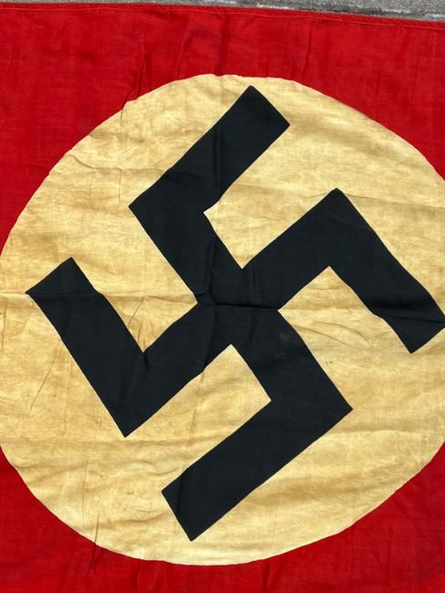 A WWII Second World War style Third Reich Nazi German NSDAP party flag. The flag in red and white, with central black swastika. 1940 date to the seam. Measures approx 80x140cm.