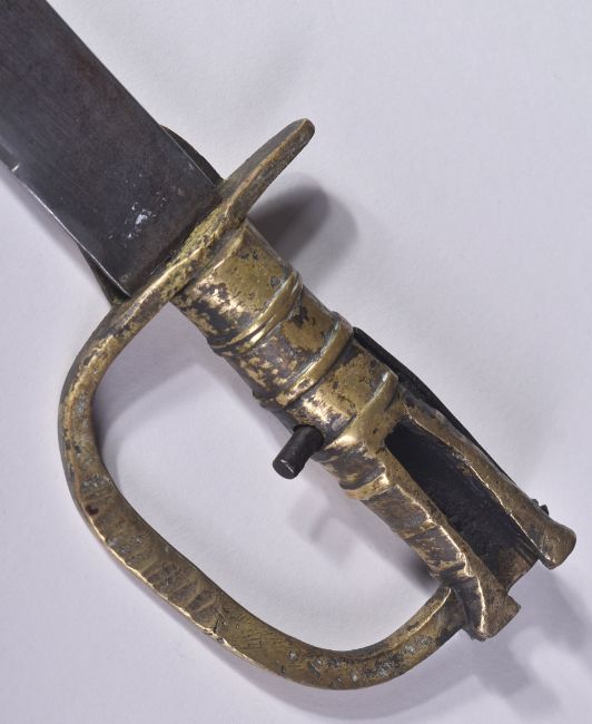 An early 19th Century circa 1820 British Baker rifle sword bayonet. The brass hilt having an open attachment slot, ribbed grip with press stud and knuckle guard. The single edged blade with some pitting, commensurate with age. Measures approx 66cm.