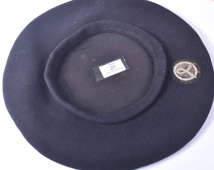 A WWII Second World War related French Milice ( Milita ) Officers beret. Blue wool construction with the organization's emblem of a Greek letter Y within a circle sewn to the front in a silver bullion thread.