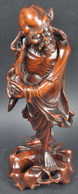 A large 19th Century Chinese hand carved figurine depicting an emaciated elder immortal figurine / Lohan Buddha. The figure modelled with bare chest and exposed ribe, robe draped and raised on carved socle base. Measures approx; 33cm tall.