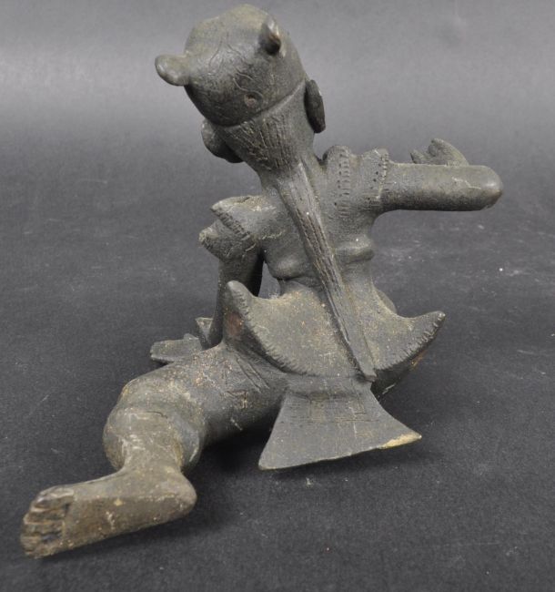 An early 20th Century Indian bronze figurine depicting a young boy in ornate outfit set with coloured glass cabochons. The boy modeled seated with hand raised wearing a tigers / animal head. Measures approx; 10cm x 13cm.