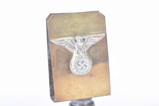 A WWII Second World War Third Reich Nazi German table top matchbox holder. Brass construction with applied white metal Eagle Swastika badge. Inscribed to the reverse ' Ein Volk, Ein Reich, Ein Fuhrer ' (One Nation One Empire One Leader). Measures approx. 10cm.Note; from a large private collection of militaria. Due to the nature of the items, buyers are reminded for the need to satisfy themselves as to condition / originality / authenticity prior to bidding. All lots remains sold strictly 'as is' irrespective of any description.