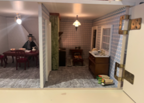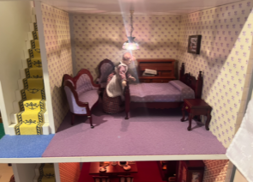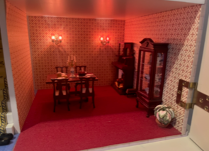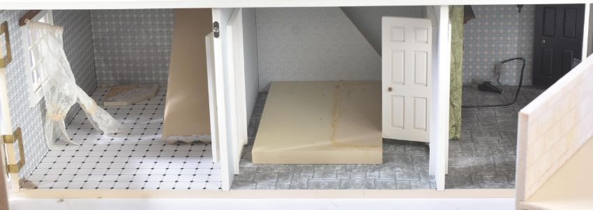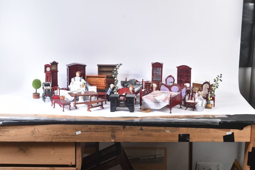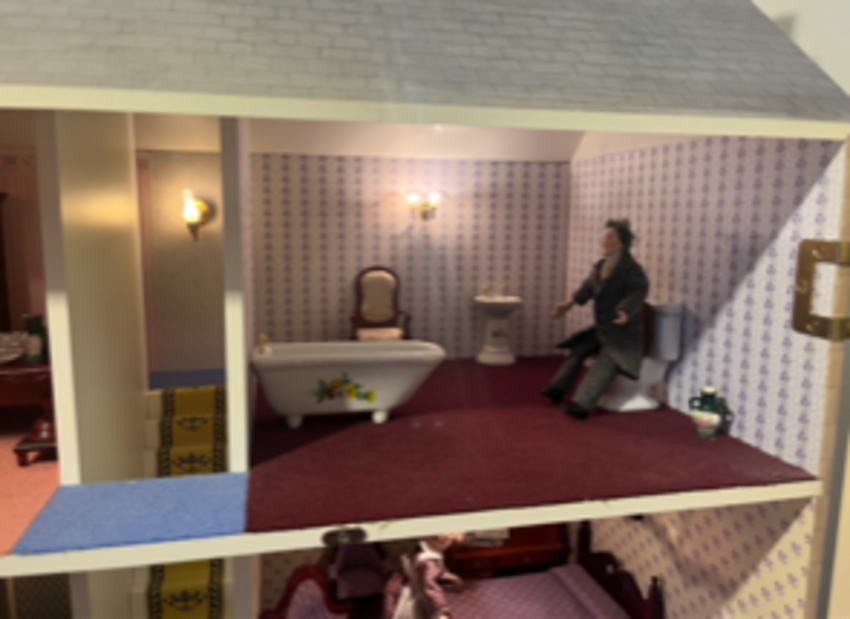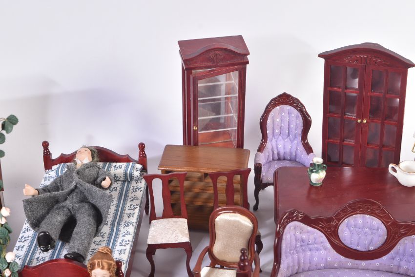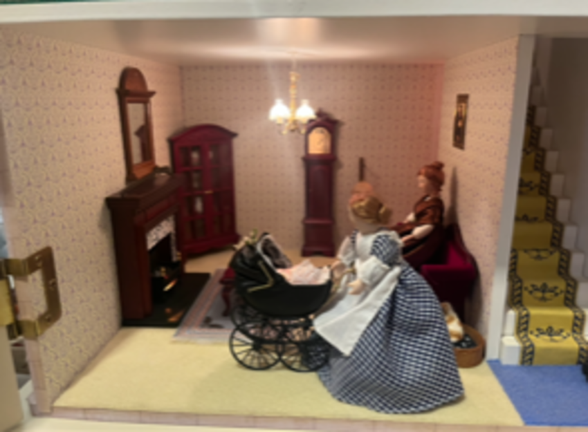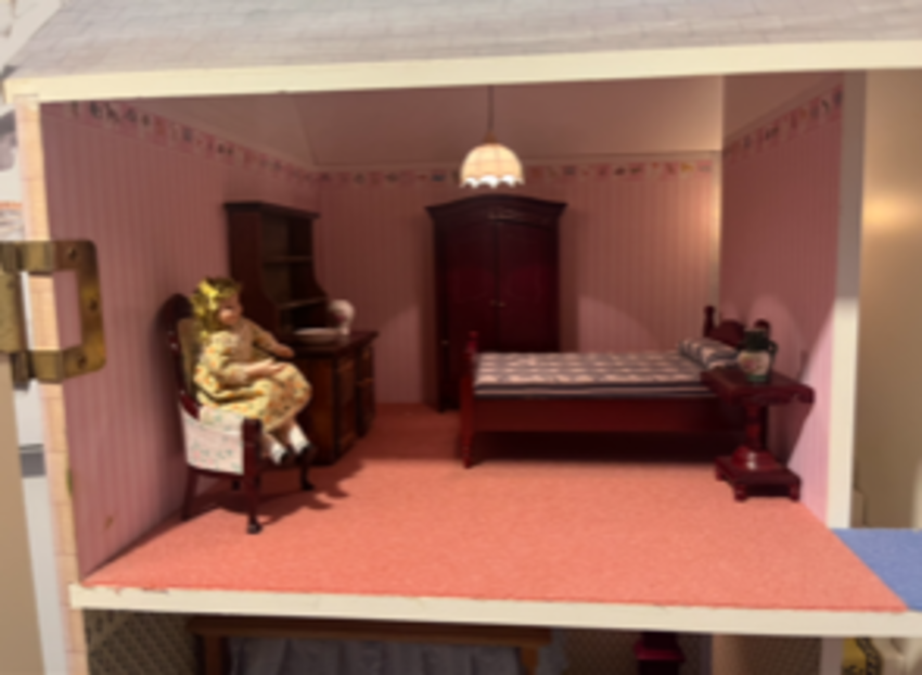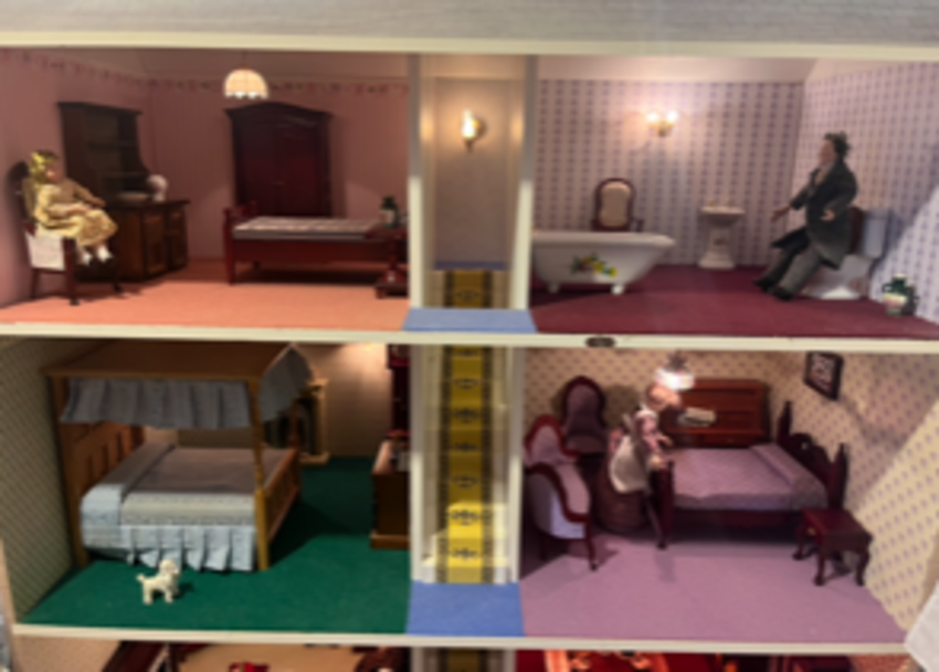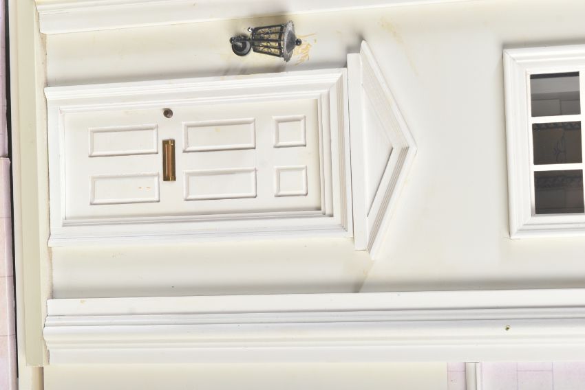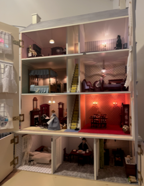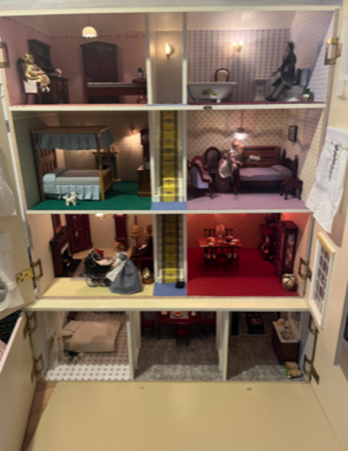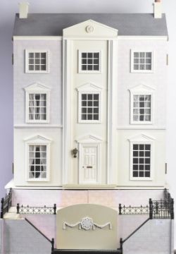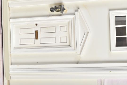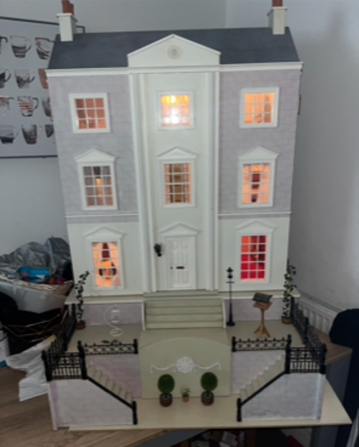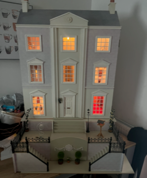Dolls House - Georgian Manor - a large Georgian style dolls house in the form of a large manor house with a large selection of furniture. Cream and pink exterior with four storeys, including a basement section and stepped entranceway to front. Electric wires to the rear. Dismantles into three sections to aid transport. DELIVERY / COLLECTION - Nationwide Delivery is available on this lot, please contact us to arrange a quote.