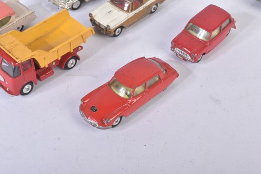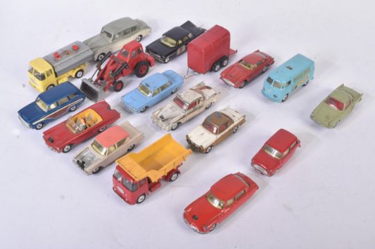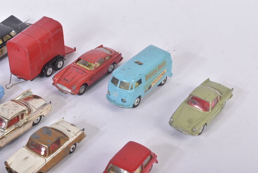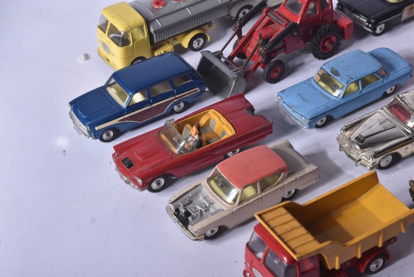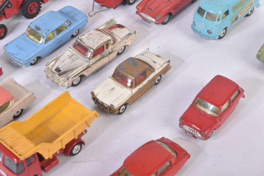 A collection of assorted vintage Corgi Toys and Dinky Toys diecast model cars to include; Corgi Toys Studebaker, Ford Consul Cortina, Dinky Toys Rolls Royce Phantom V and others. Conditions appearing G/VG.