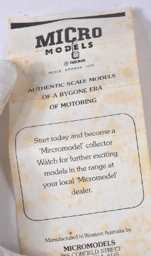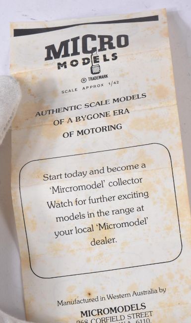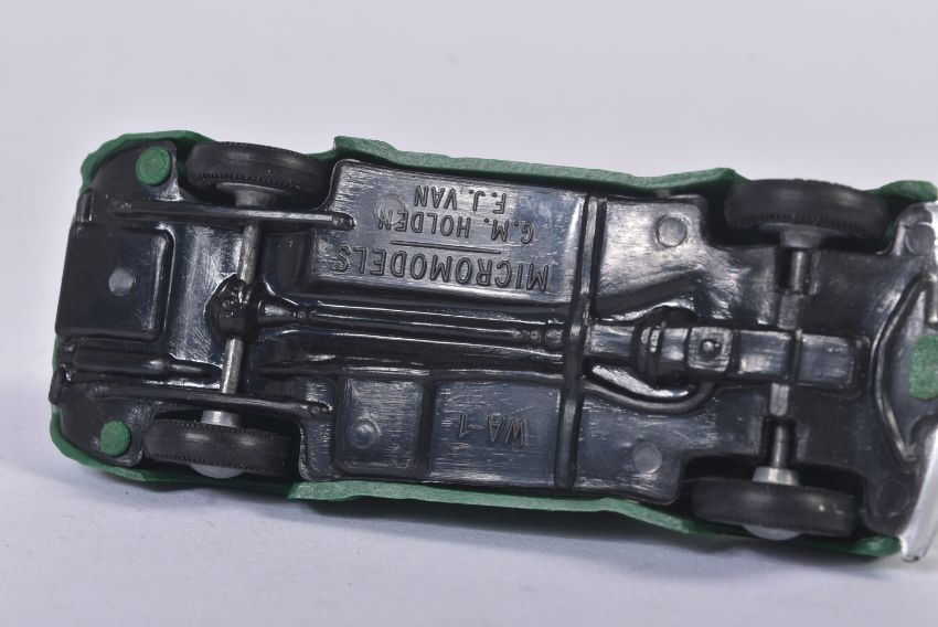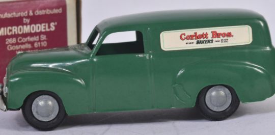 An vintage 1950s Australian Micro Models boxed plastic model of an F.J Holden Van. Green body with black rubber wheels and original Corlett Brothers Bakers sticker decal. Housed within the original box with paperwork.