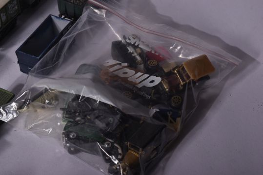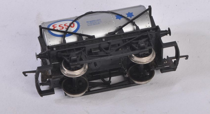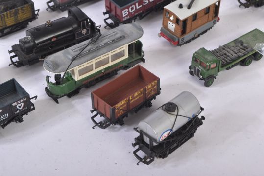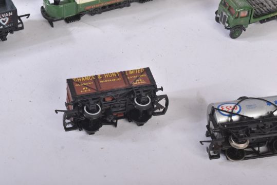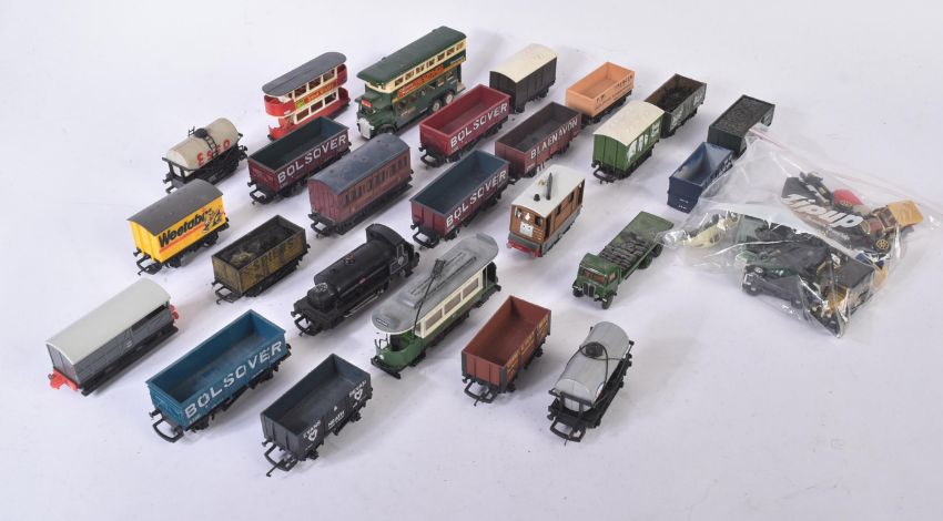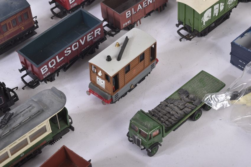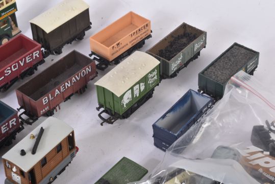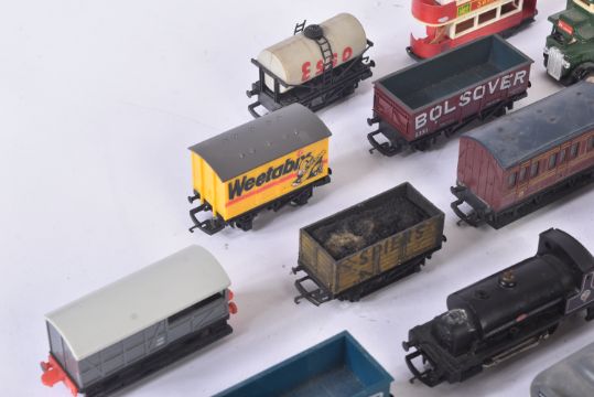 A collection of assorted OO gauge model railway trainset locomotive engine rolling stock wagons along with some 1/76 scale trackside diecast and x1 Hornby Lancashire Yorkshire 0-4-0ST locomotive. Rolling stock to include Esso petrol tankers, salt wagons, open vans and others.