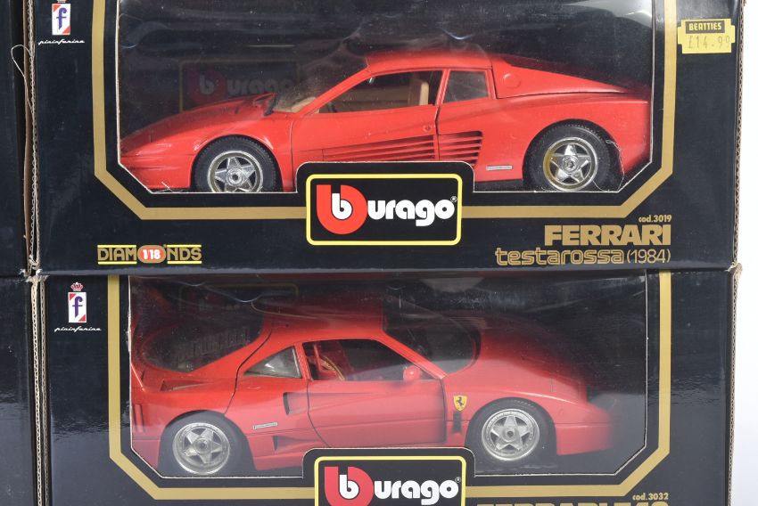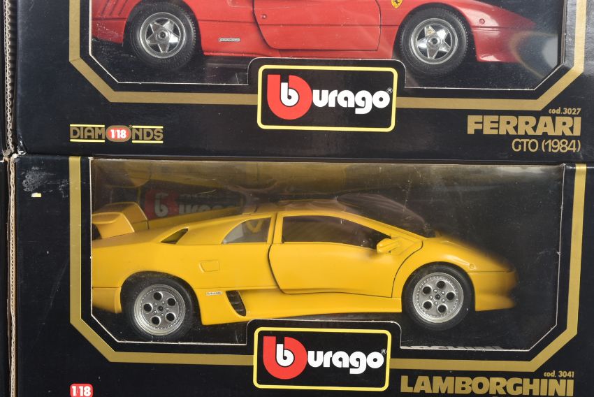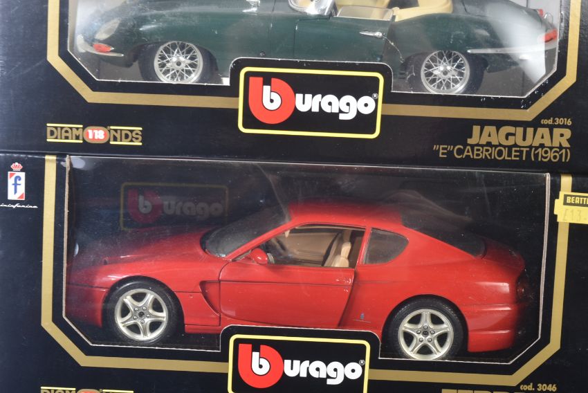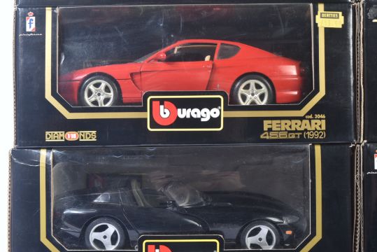 A collection of x8 Burago / Bburago 1/18 scale boxed diecast model cars. Examples to include; Dodge Viper RT/10, Mercedes Benz SSK, Ferrari Testarossa and others. Appearing loose from inner packaging.