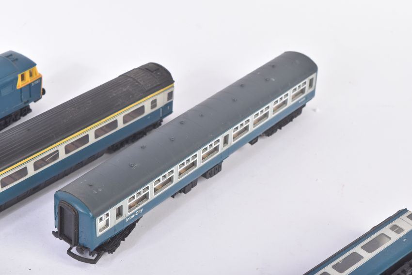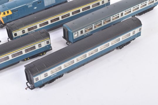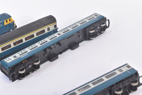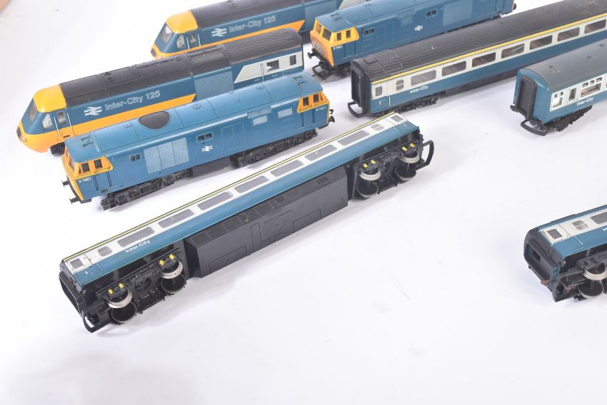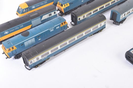 A collection of vintage Hornby OO gauge model railway diesel trainset locomotive engines and carriages. Locos comprising R758 Class 35 Hymek No. D7063 and Intercity 125 High Speed Train (Class 43) with dummy car and a rake of x4 carriages.