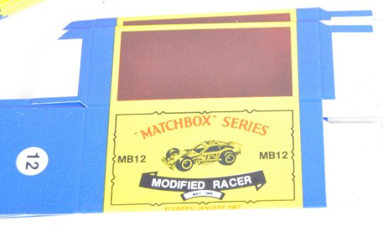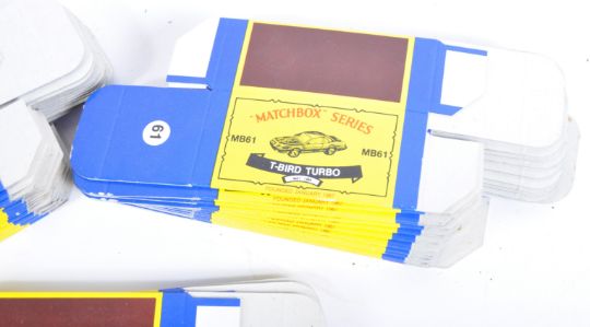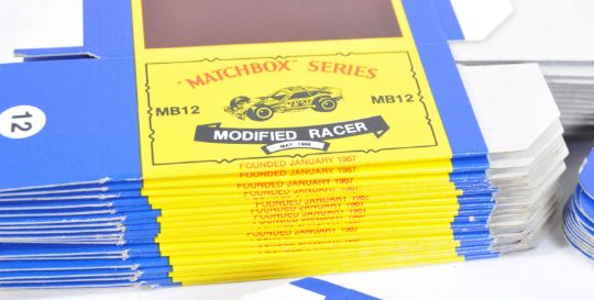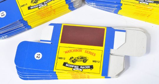 A large collection of Matchbox Series re-issue / replica diecast model boxes comprising MB12 Modified Racer and MB61 T-Bird Turbo. Flat pack examples after the vintage Matchbox originals.