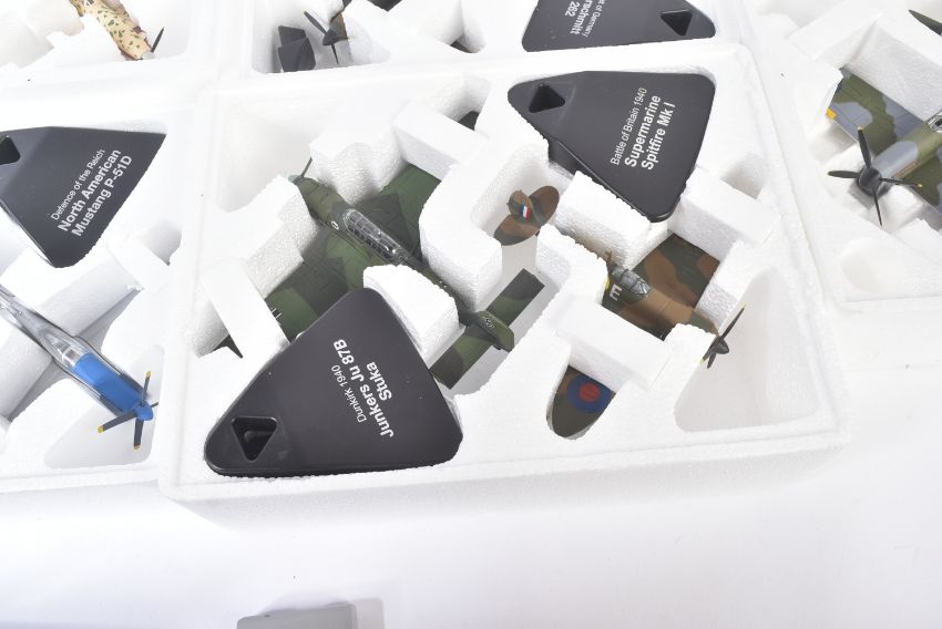 A collection of assorted Atlas Edition boxed aviation diecast model aeroplanes / planes of military interest. Examples to include North American Mustang P-51D, Supermarine Spitfire Mk 1, Hawker Tempest V and others. Highly detailed models with display stands.
