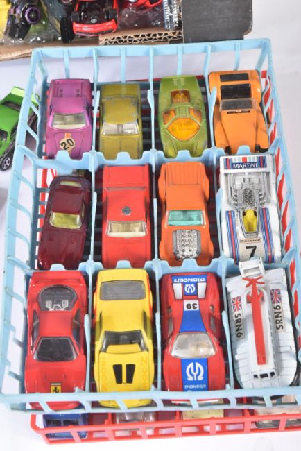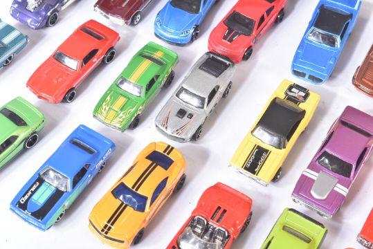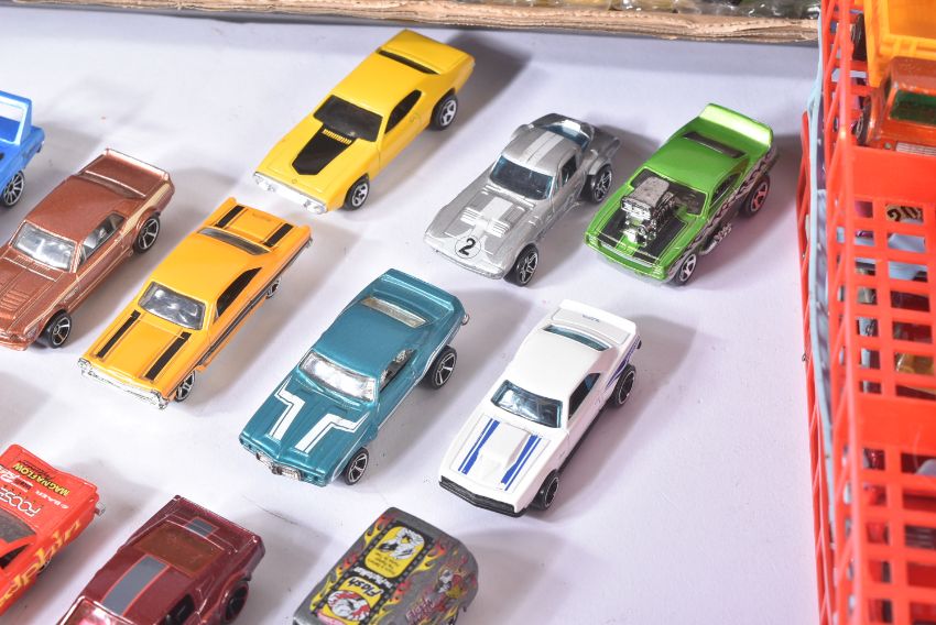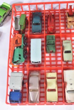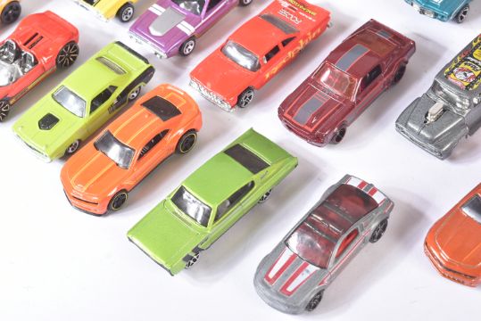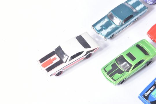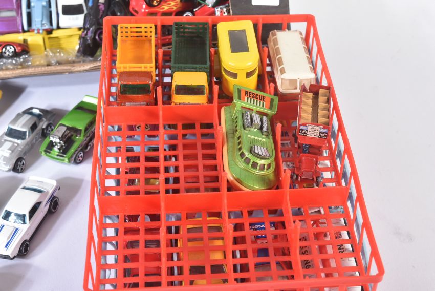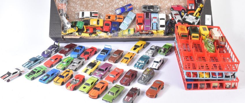 A collection of assorted vintage loose diecast model cars, largely Mattel made Hot Wheels along with some older Lesney Matchbox examples with some trays for the original vinyl carry case. Examples to include; Lesney No. 33 Ford Zodiac, No. 57 Wolseley 1500, Hot Wheels Corvette Stingray, Pontiac Firebird and others. Generally VG+ conditions.
