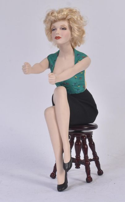 An original Franklin Mint hand painted Marilyn Monroe porcelain doll figurine ' Unforgettable Marilyn '. The figure dressed in a green blouse and black skirt based on a photograph by Milton H. Greene. Retaining original paperwork. Measures approx. 34cm.