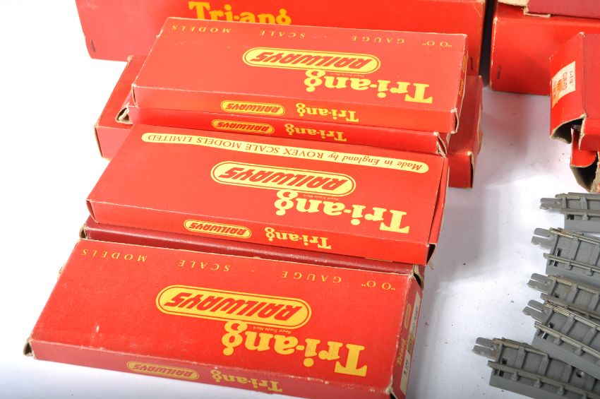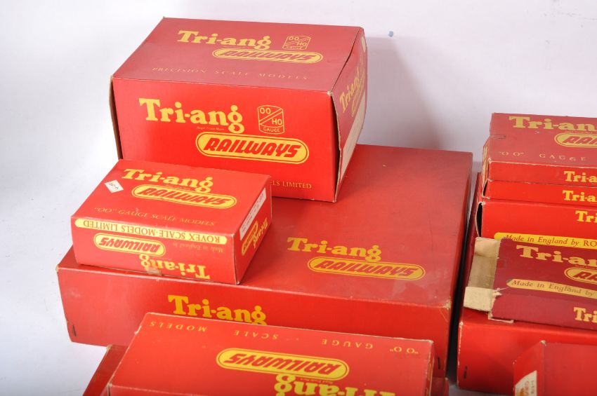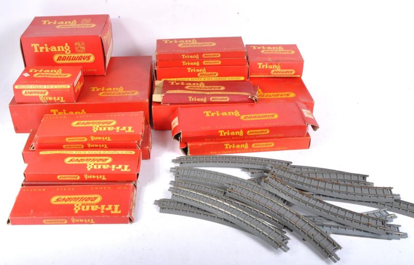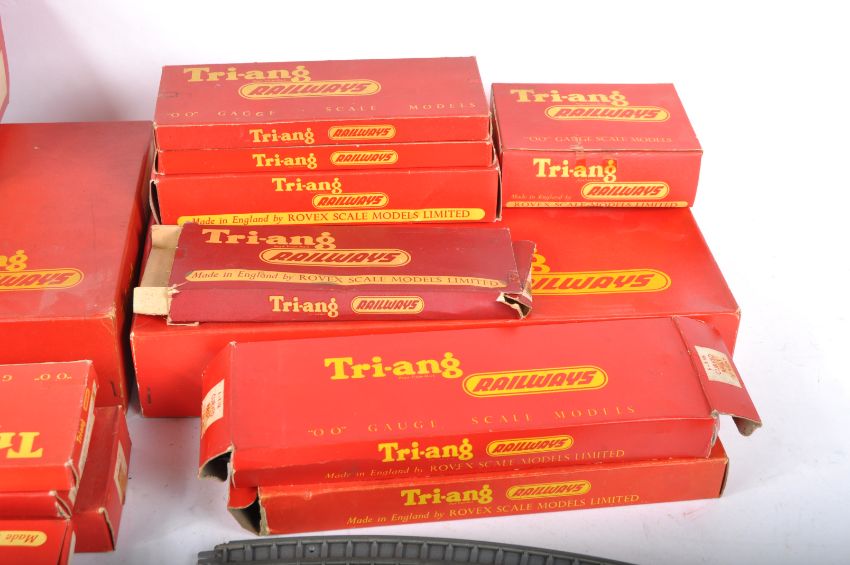 A collection of assorted vintage Triang / Tri-ang 00 gauge model railway trackside accessories and track pieces. Examples comprising; R.460 Straight Platform Unit, R.81 Station Set, R.119 Operating Mail Coach Set and a selection of straight, curved and points track pieces. All contents with original boxes.