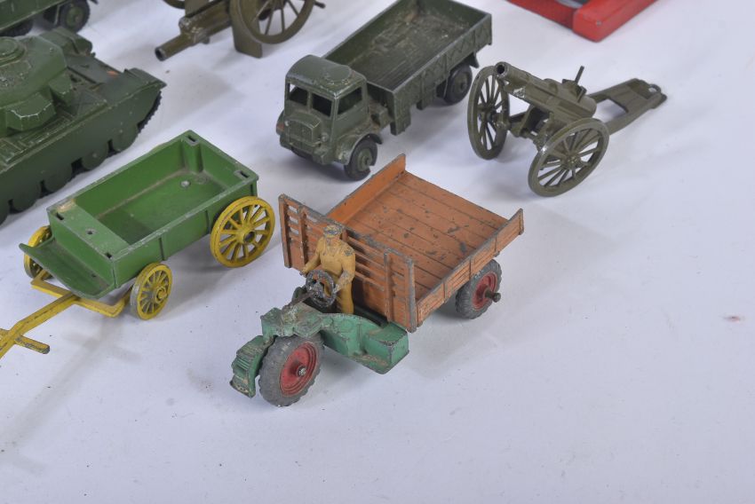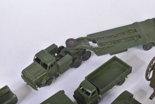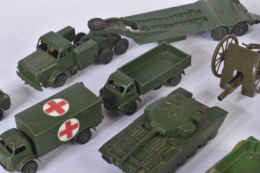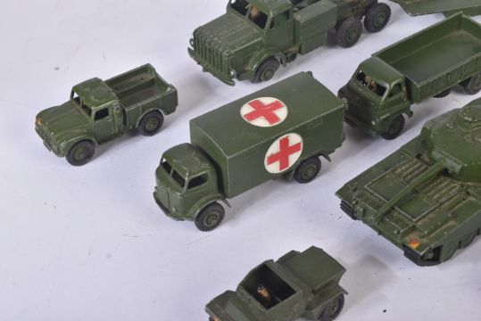 A collection of vintage Dinky Toys diecast model vehicles of Military interest to include; 660 Tank Transporter with Thornycroft Mighty Antar, 651 Centurion Tank, 626 Military Ambulance. Conditions Fair / Good+.