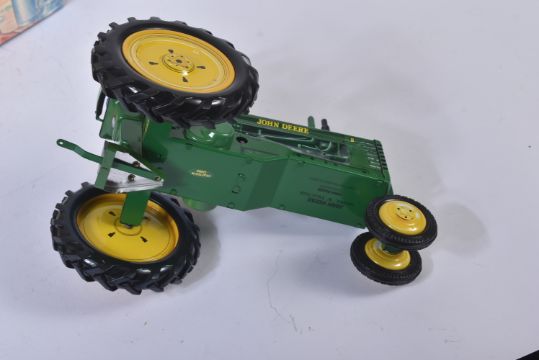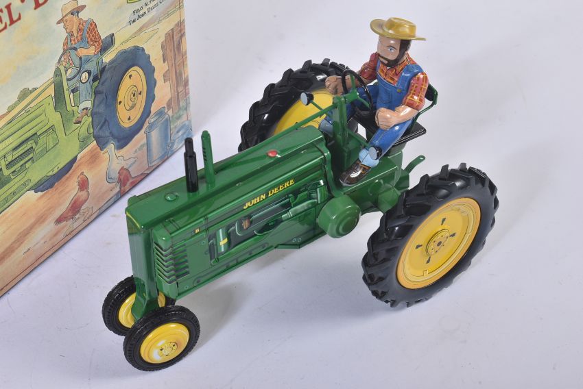 An original Franklin Mint boxed tinplate clockwork model John Deere Model ' B ' Tractor. The model with original wind up key and paperwork, housed within the original box.