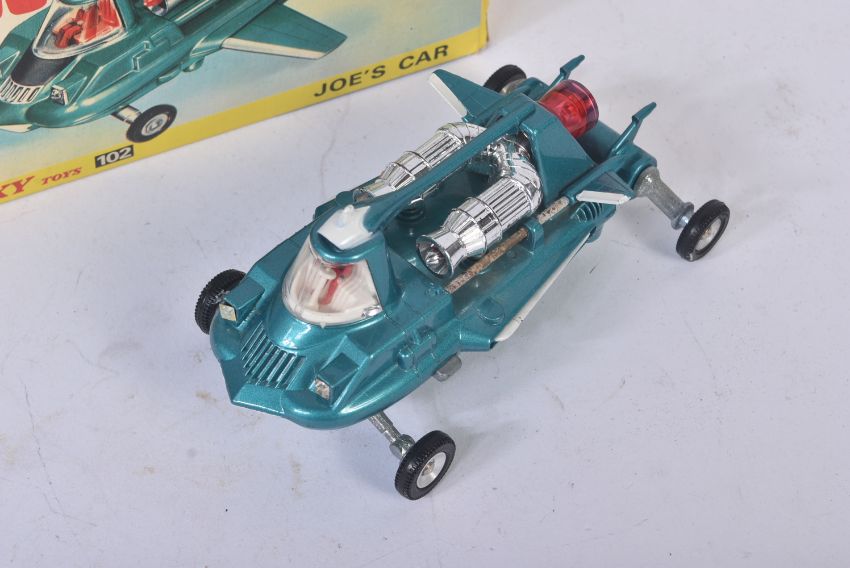 An original vintage Dinky Toys Jerry Anderson Joe 90 diecast model No. 102 ' Joe's Car '. The model with automatic opening wings and tail fins retaining the original inner packaging and outer box. Appears VG+.