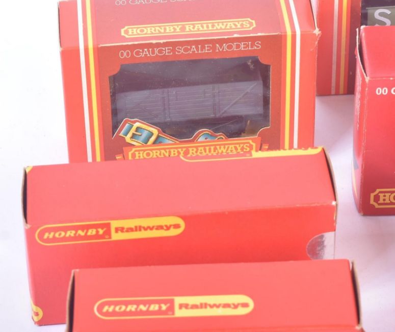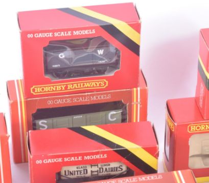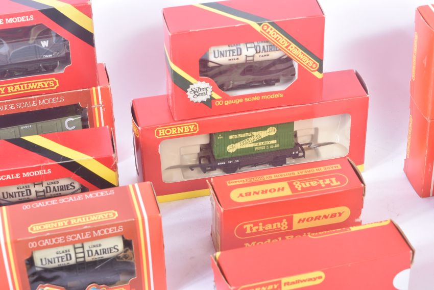 A collection of Hornby OO gauge model railway trainset locomotive rolling stock to include; United Dairies Milk Tank Wagon, Pilkington Wagon, GWR Plank Wagon and others. Housed within original boxes. Some duplicates.
