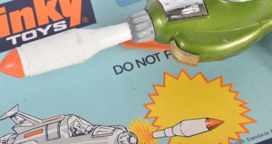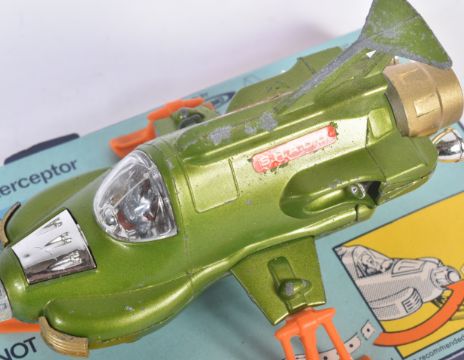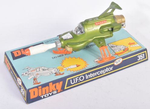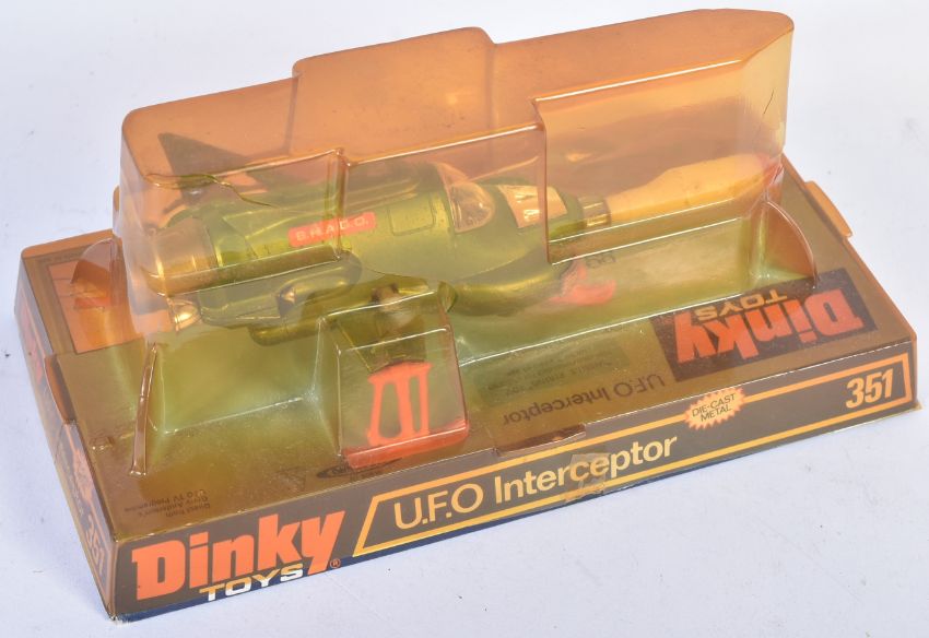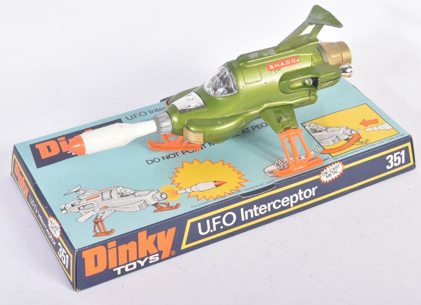 An original vintage Dinky Toys made diecast model No. 351 SHADO UFO / Interceptor from Gerry Anderson's UFO. Green variant complete with working firing missile. Model appears G+ with original blister pack / box.