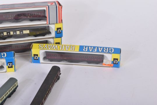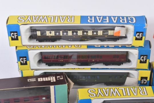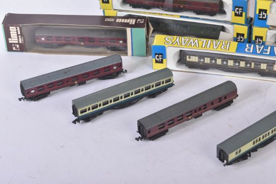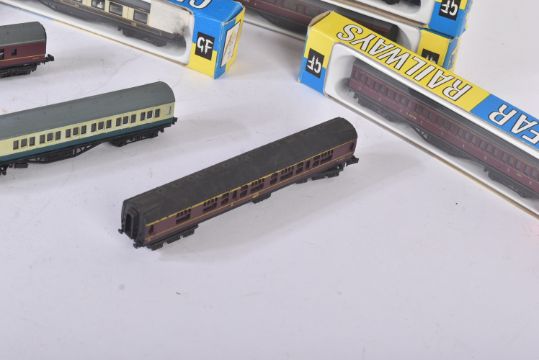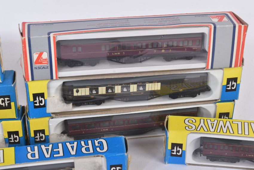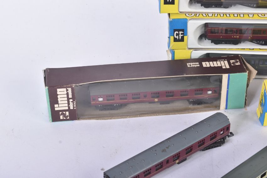 A collection of vintage N gauge model railway trainset locomotive rolling stock coaches / carriages to include; Graham Farish (x3 Pullman carriages, x3 LMS maroon carriages and x1 Southern), Lima British Railways coaches, TTR Twix Twin Railways and others.