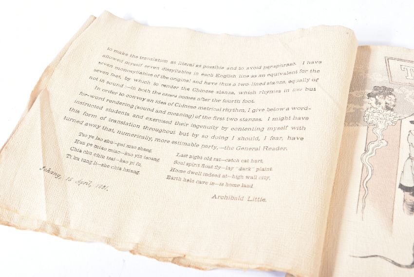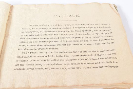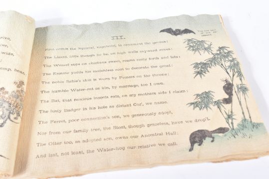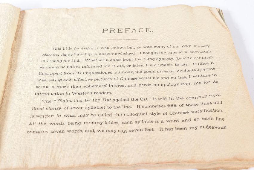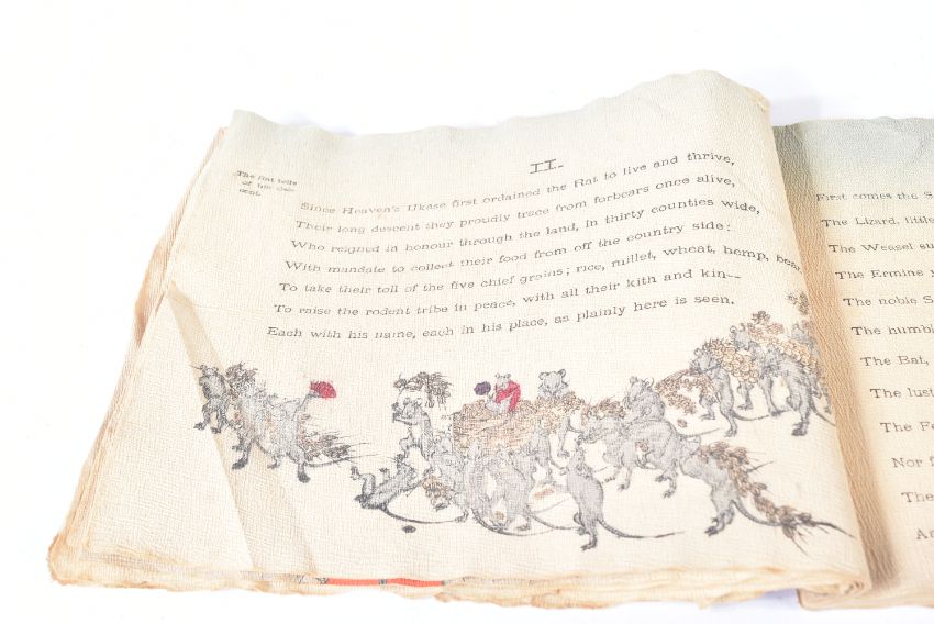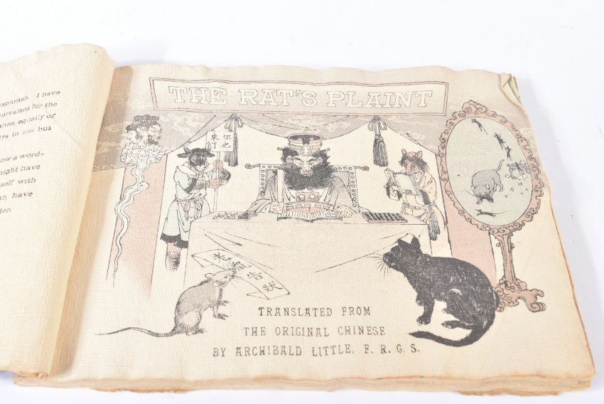 A charming late 19th Century Japanese book ' The Rat's Plaint ' Second Edition published by T. Hasegawa and told in English by Archibald Little. Printed on crepe paper in folded sheets with colour illustrations. Measures approx. 15x20cm.