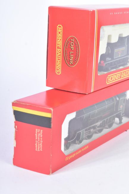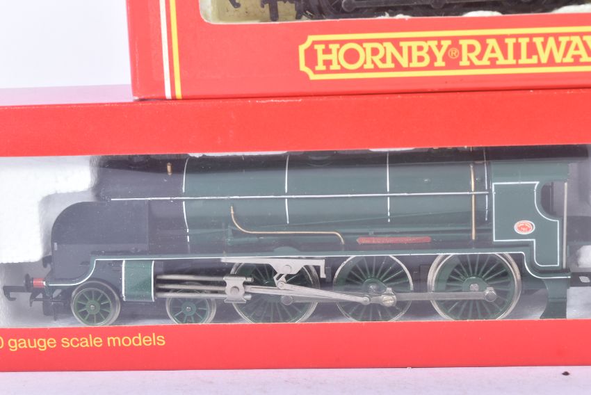 Two vintage Hornby OO gauge model railway trainset locomotive engines comprising; R2063 Southern Railways Terrier locomotive ' 2 ' and R154 Southern Railways Sir Dinadan loco. Both models with original boxes.