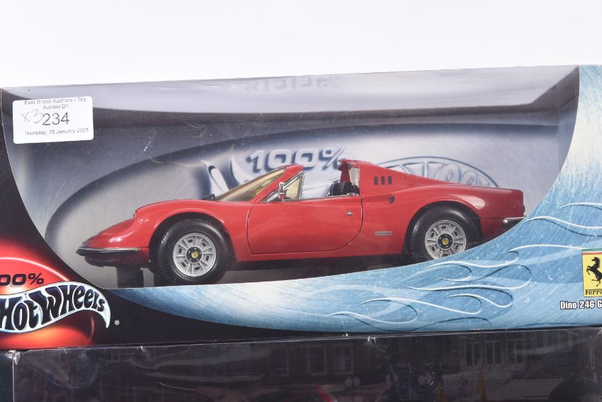 A collection of x3 Mattel made Hot Wheels 1/18 scale diecast model cars comprising; 50424 DeTomaso Pantera, 25730 Ferrari 365 GTS/4 and 54601 Ferrari Dino 246 GTS. Models on inner display stands with original boxes.