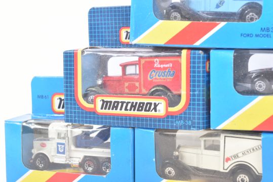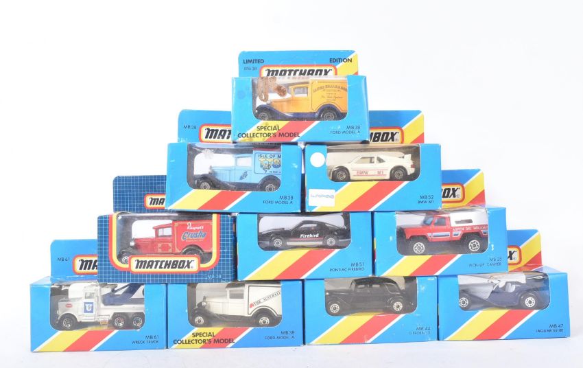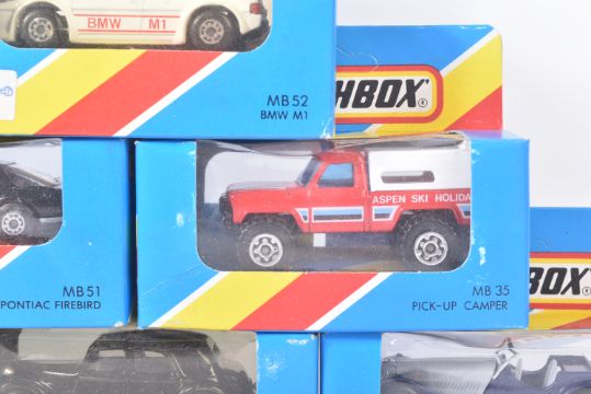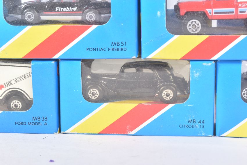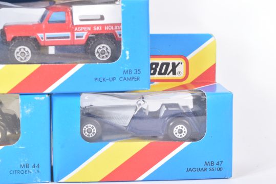 A collection of x10 vintage Matchbox diecast models cars / vans / trucks etc to include; MB47 Jaguar SS100, MB51 Pontiac Firebird, MB44 Citroen 15 and others. Contents appearing unused, within unpunched boxes.