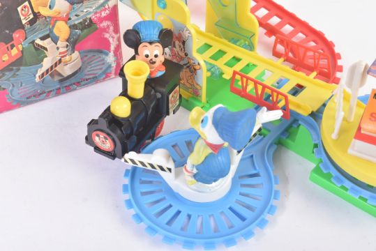 A vintage Mickey Mouse ' Turn Over Choo Choo ' Disney train. The battery operated train rides along the track and reaches the station where the platform revolves. Housed within the original box.