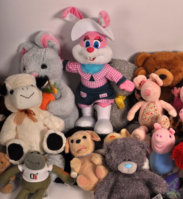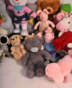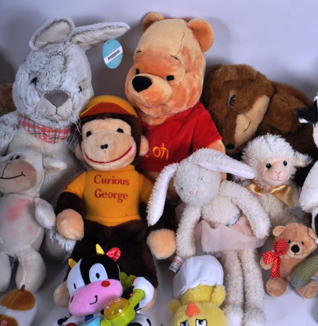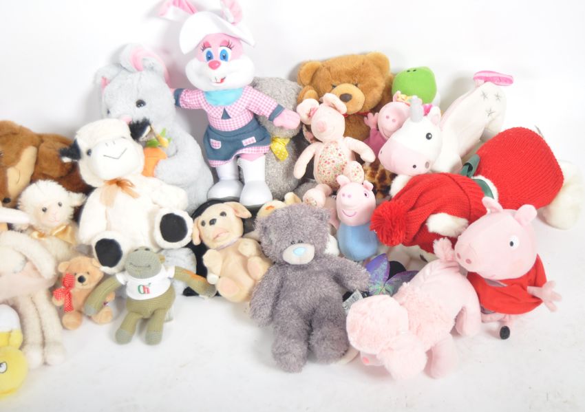 Teddy Bears - a quantity of assorted teddy bears / plush toys to include: Curious George, Paws, Easter, Disney, Peppa Pig, RBI and others. Tallest measures approx. 45cm