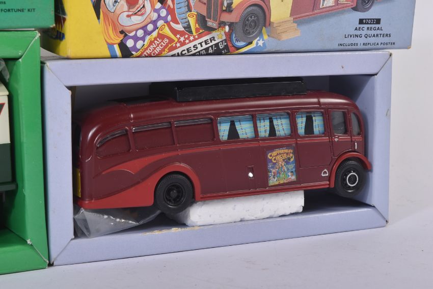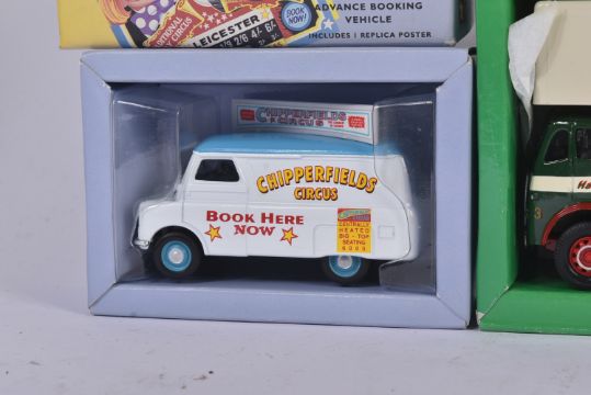 A collection of Corgi Chipperfields Circus and The Showmans Range boxed diecast models comprising; 96905 Advance Booking Vehicle, 97022 AEC Regal Living Quarters (with replica poster) and 09901 ERF Dodgem Truck & Box Trailer set. Contents appearing mint, within original boxes.