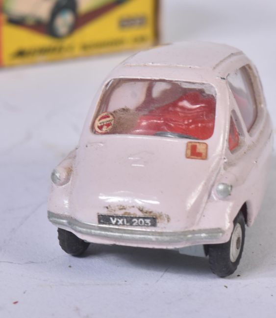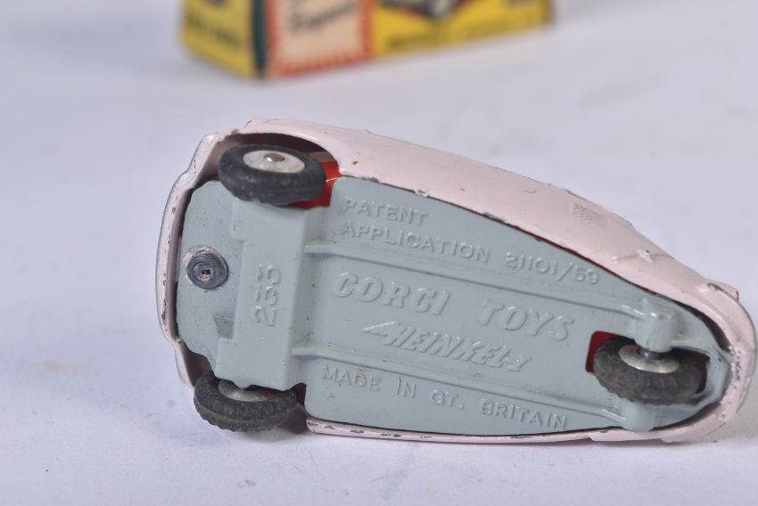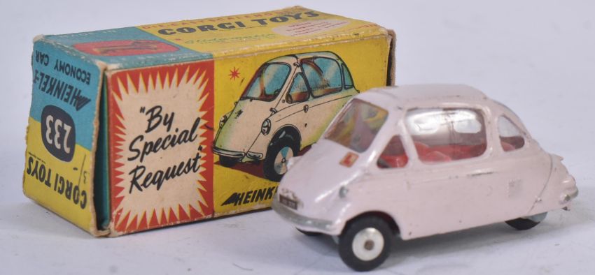 An original vintage Corgi Toys boxed diecast model No. 233 Heinkel Economy Car. Light pink body with red interiors. Housed within original box, one flap loose.