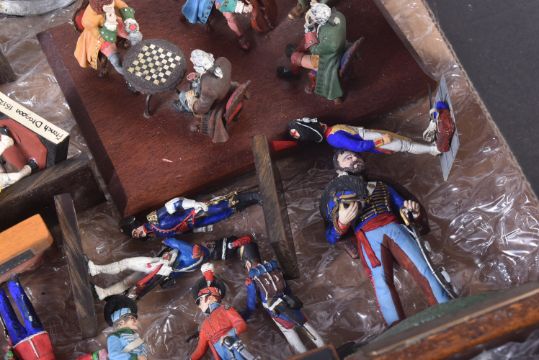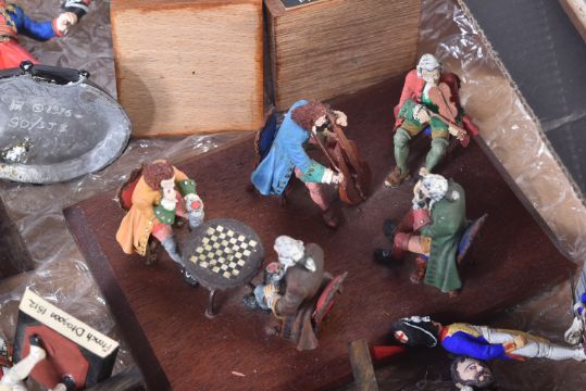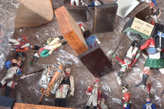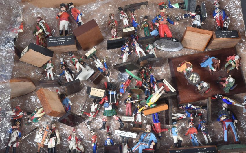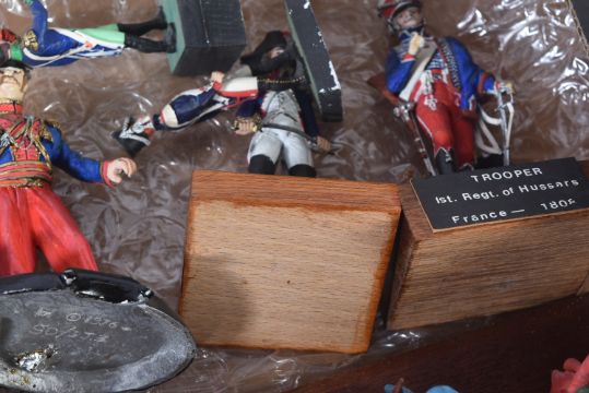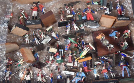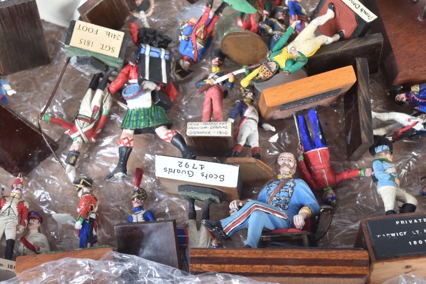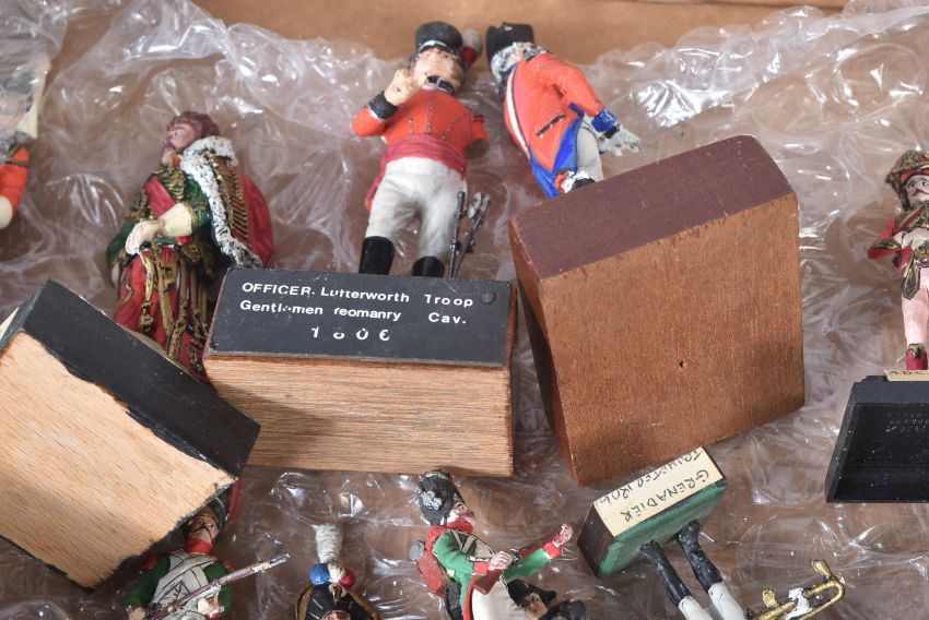 A collection of assorted vintage lead, resin and plastic constructed toy soldier figures. Largely Napoleonic interest to include; Trooper of the 1st Regiment of Hussars France 1808, Coastguard Gunner France 1810, French Dragoons, Grenadiers of the French Imperial Guards and others. Mounted to bases, some with regiment labels.
