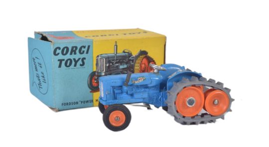 An original vintage Dinky Toys boxed diecast model No. 54 Fordson Power Major with Roadless Hal Tracks. Blue body with orange plastic hubs and grey tracks. Appearing VG+ within original box.