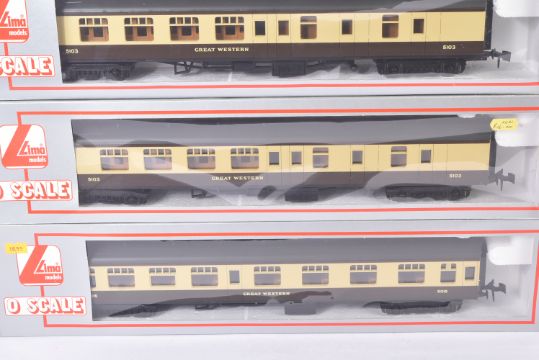 A collection of x4 Lima O gauge model railway trainset locomotive rolling stock coaches / carriages comprising x3 GWR brown and cream coaches and x1 Mk1 Brake 3rd 34100 in BR Crimson & Cream. Housed within original boxes.