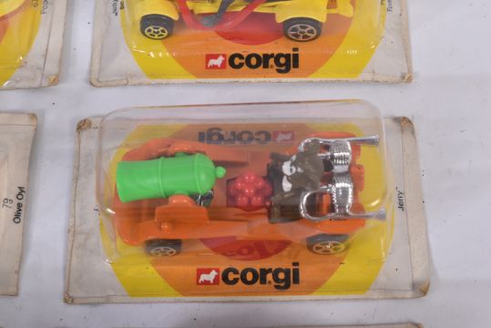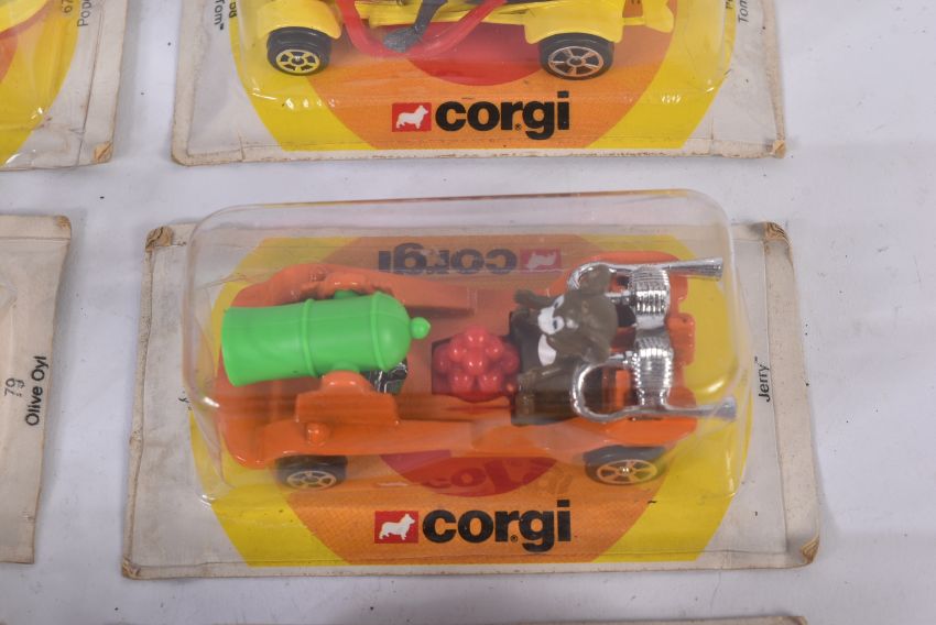 A collection of x6 original vintage Corgi TV and film / cartoon related diecast models comprising; 67 Popeye, 79 Olive Oil, 19 Pink Panther, 84 Bugs Bunny, 58 Tom and 38 Jerry. Models appearing unused within sealed blister packs.