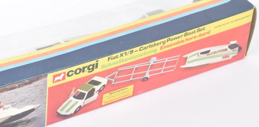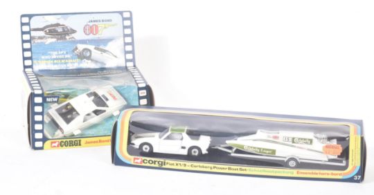 Two vintage Corgi made diecast models comprising; No. 37 Fiat X1/9 Carlsberg Power Boat Set and No. 269 James Bond Lotus Esprit. Contents appearing VG+ within original boxes.