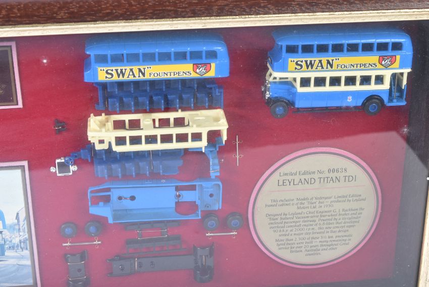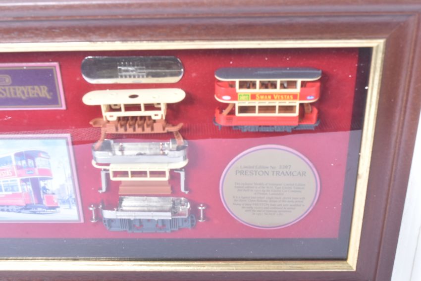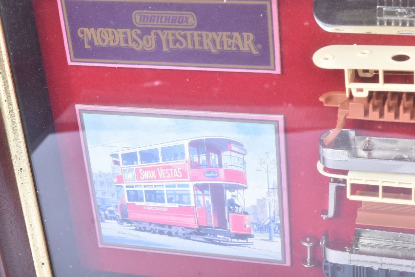 A collection of x3 Limited Edition Matchbox Models of Yesteryear diecast display cases. Models comprising; Yorkshire Steam Wagon, Leyland Titan TD1 and Preston Tram Car. Framed and glazed.
