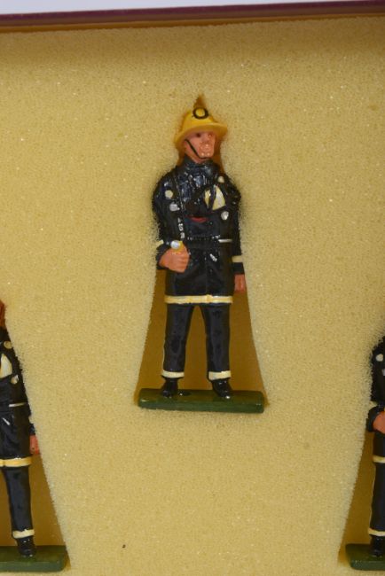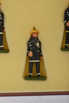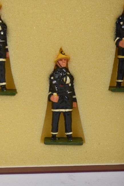 A collection of vintage 1990s hand painted white metal fire fighter model figurines. The Firemen in full uniform with helmet and air tanks, mounted on green metal bases. Detailed models appearing mint within original box.