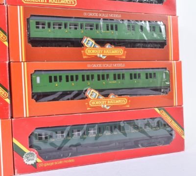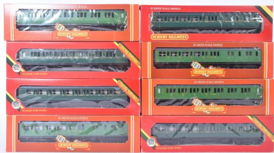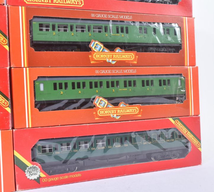 A collection of x8 vintage Hornby OO gauge model railway rolling stock coaches / carriages comprising x4 Southern Railway coaches and x4 Southern Railway Malachite livery coaches. Boxed examples appearing unused.
