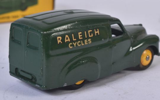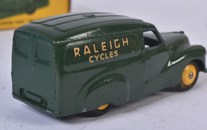 An original vintage Dinky Toys boxed diecast model No. 472 Austin Van Raleigh Cycles. Dark green body with back rubber tyres and yellow hubs. Yellow ' Raleigh Cycles ' letters. Model appearing VG+ within a G original box, lacking one flap.