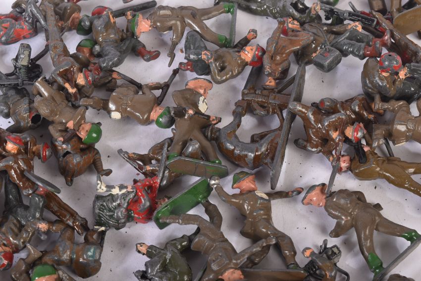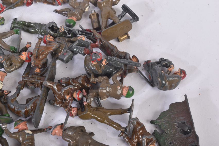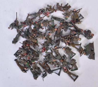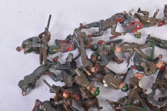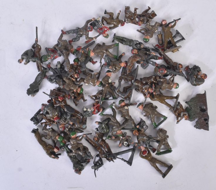 A collection of assorted vintage, likely Britain's made, lead toy soldiers. Various examples of soldiers in battle posed positions with weapons and largely mounted on lead bases.