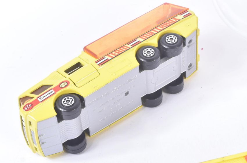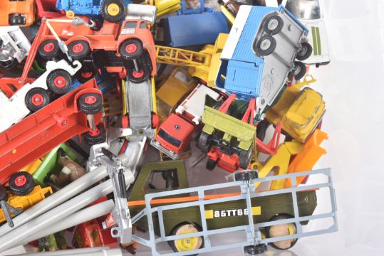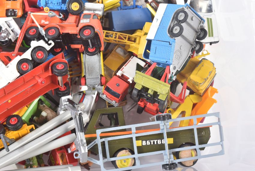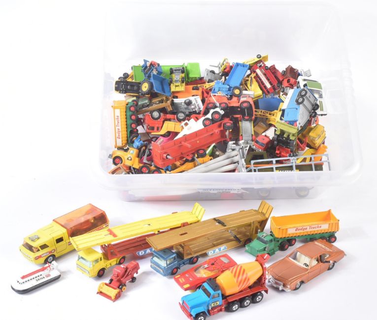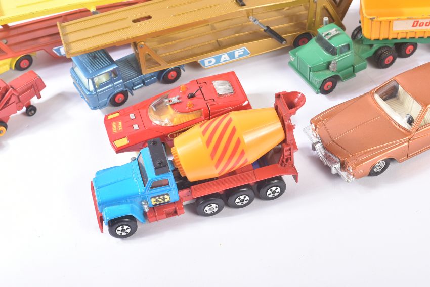 A collection of assorted vintage diecast model cars, trucks and haulage vehicles. Largely Lesney made Matchbox Superkings and Superfast examples to include; Racing Car Transporter, Cement Mixer, Shovel Nose Fire Chief Car and others. Models generally appearing G-VG.